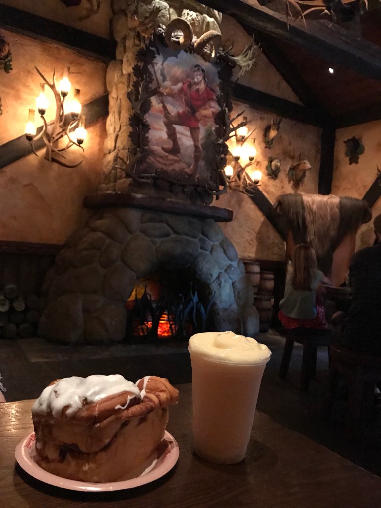 If you like antlers in all of your decorating this is the perfect spot for you. This quick service snack location is a great spot to come for a quick bite and a cool drink and is perfect for Beauty and the Beast fans. It located in the new part of Fantasyland right next to Be Our Guest restaurant and Ariel’s Undersea Adventure ride! I came around 11am before my shift to sit down and have a LeFou’s Brew before work and the place was nearly empty. I can’t attest to when this area gets crowded but I would suggest early morning or mid-afternoon.